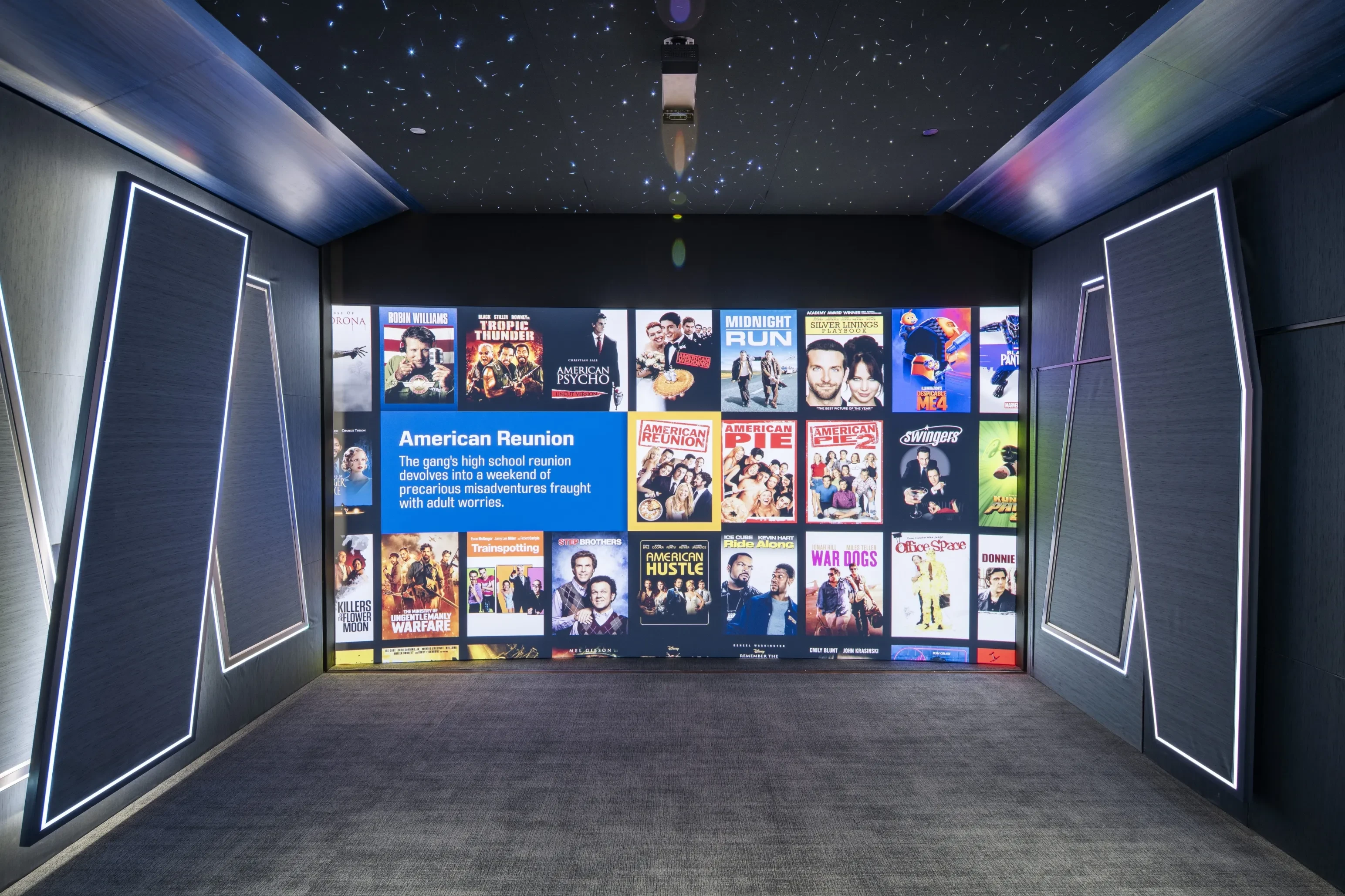 Home theater interior designer Lisa Slayman ensured that the room avoided the traditional “black box” aesthetic. Custom blue-stained veneer wraps architectural elements, geometric motifs add visual rhythm, and projection equipment is concealed within a purpose-built hush enclosure.