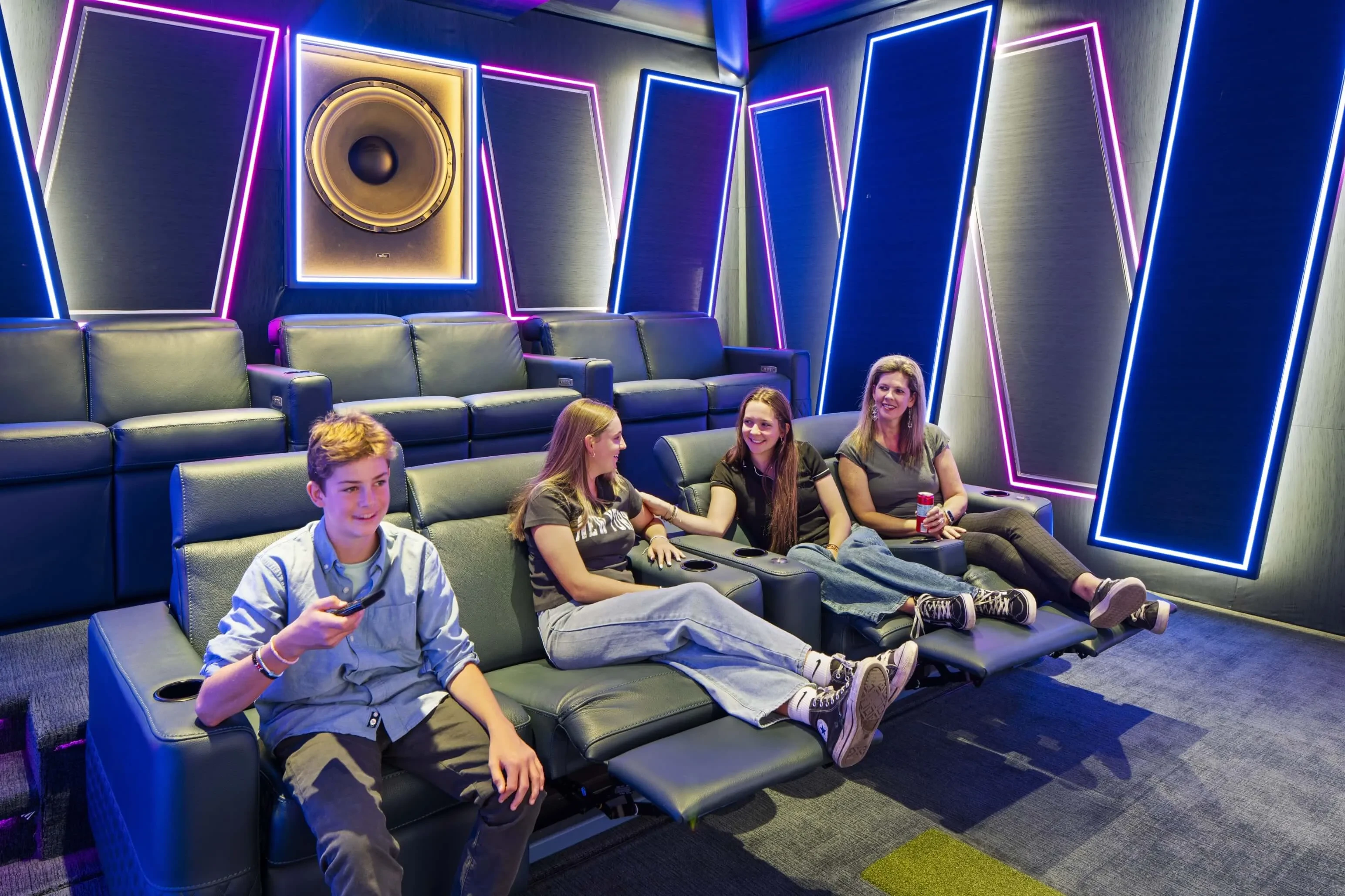 Originally planned to be hidden, the ASCENDO 32-inch subwoofer remains visible at the client’s request, a sculptural statement that reflects the system’s performance intent. Lisa framed the subwoofer with eye-catching LED lighting to draw attention to its size and sublime presence in the room.